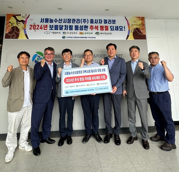 지난 9일 서울청과, 중앙청과, 동화청과, 대아청과 등 4개 도매법인은 가락시장 공익법인 (사)희망나눔마켓(이사장 이원석)과 함께 서울 도매시장을 관리하는 서울농수산시장관리(주)를 방문해 추석 명절 격려품 전달식을 갖고 서울 도매시장 미화원, 주·야간 교통질서요원 등 취약계층 종사자의 노고에 감사를 전하며 소통의 자리를 가졌다.