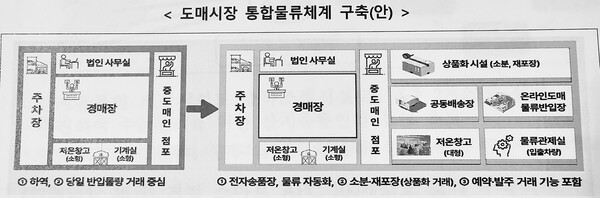 물류 개선도 추진된다. 도매시장 시설현대화 사업과 연계해 도매시장에 온라인도매시장 거래자를 위한 통합물류 기능이 추가된다. 또 단기저장, 소포장, ICT 기반 재고관리 시설을 갖추고 온라인도매시장 사전거래 정보를 바탕으로 구색 맞춤, 공동배송 등 물류서비스가 제공된다.