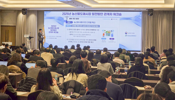 한국농촌경제연구원 김병률 박사는 농림축산식품부가 지난달 26~27일까지 충남 부여 롯데리조트에서 개최된 ‘2025년 농산물도매시장 발전방안 관계자 워크숍’ 에서 ‘농산물유통구조 고도화와 온·오프라인 도매유통 발전방향’ 이란 주제발표를 통해 이같이 주장했다.