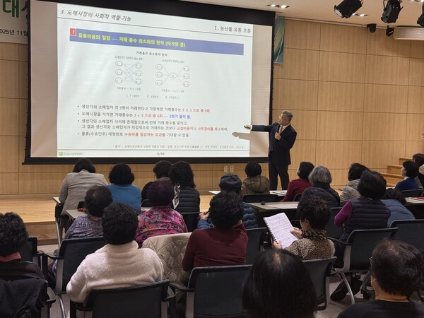 교육에서는 또 가락시장지회 이재흥 사무총장이 ‘농산물 유통 흐름 및 유통비용의 이해’를 주제로 공영도매시장의 공익적 기능을 설명했다. 도매시장이 생산자와 소비자를 연결하는 ‘가격·정보·물류의 핵심 플랫폼’임을 강조하며 대파 가격 사례를 통해 소비자가격의 약 60%를 차지하는 유통비용은 도매법인의 이윤이 아니라 물류·인건비 등 필수비용임을 설명했다.